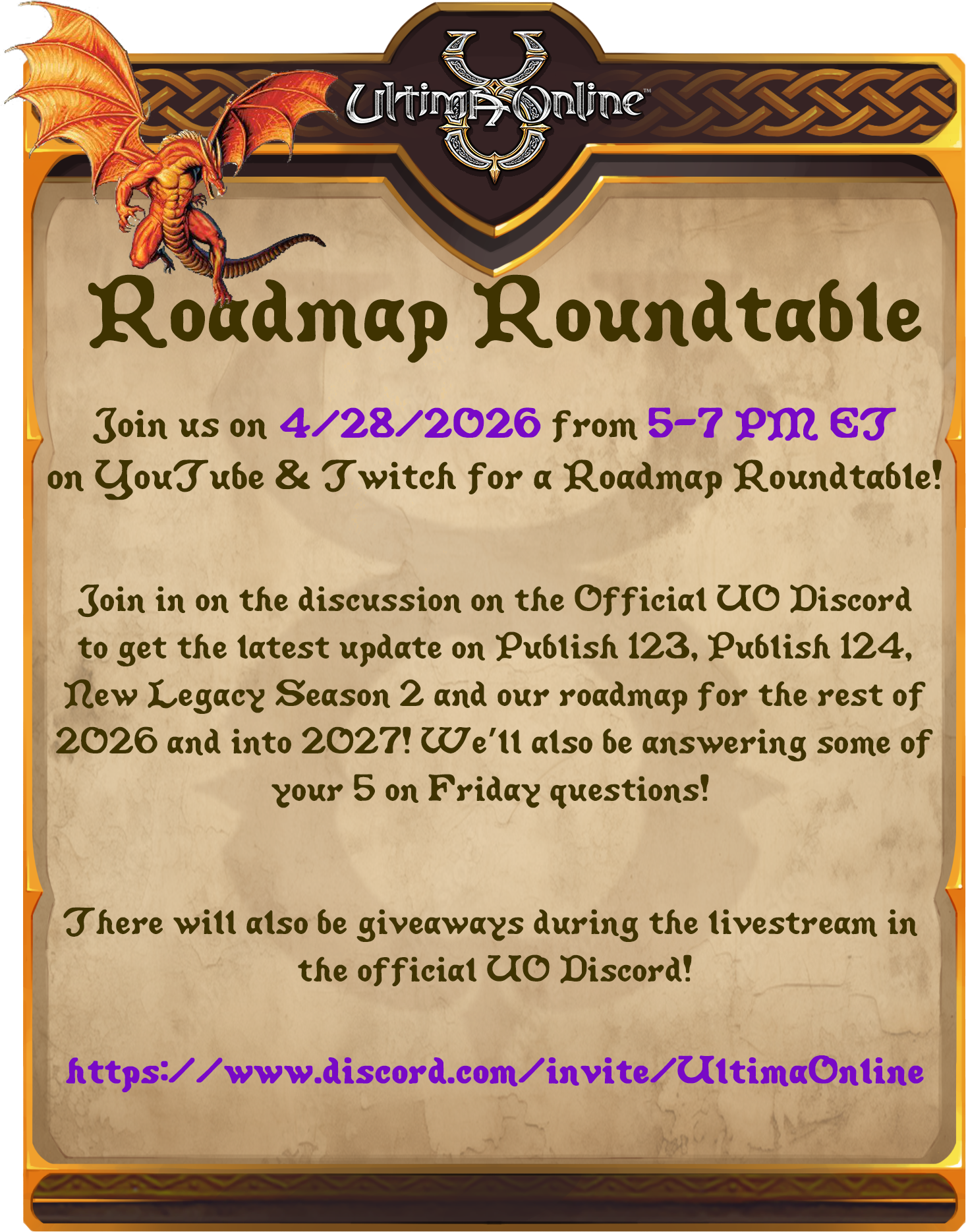 次回の開発チームによるロードマップ座談会の開催をお知らせいたします!4月29日(水・祝)午前6時-8時(日本時間)に、公式 Ultima Online Discordにご参加ください。また、公式Twitchおよび公式YouTubeチャンネルでも配信をご覧いただけます。ウルティマオンラインの開発チームと共に、パブリッシュ123および124、ニュー・レガシー・シーズン2について話し合い、皆様からのご質問にお答えする時間を過ごしましょう。
